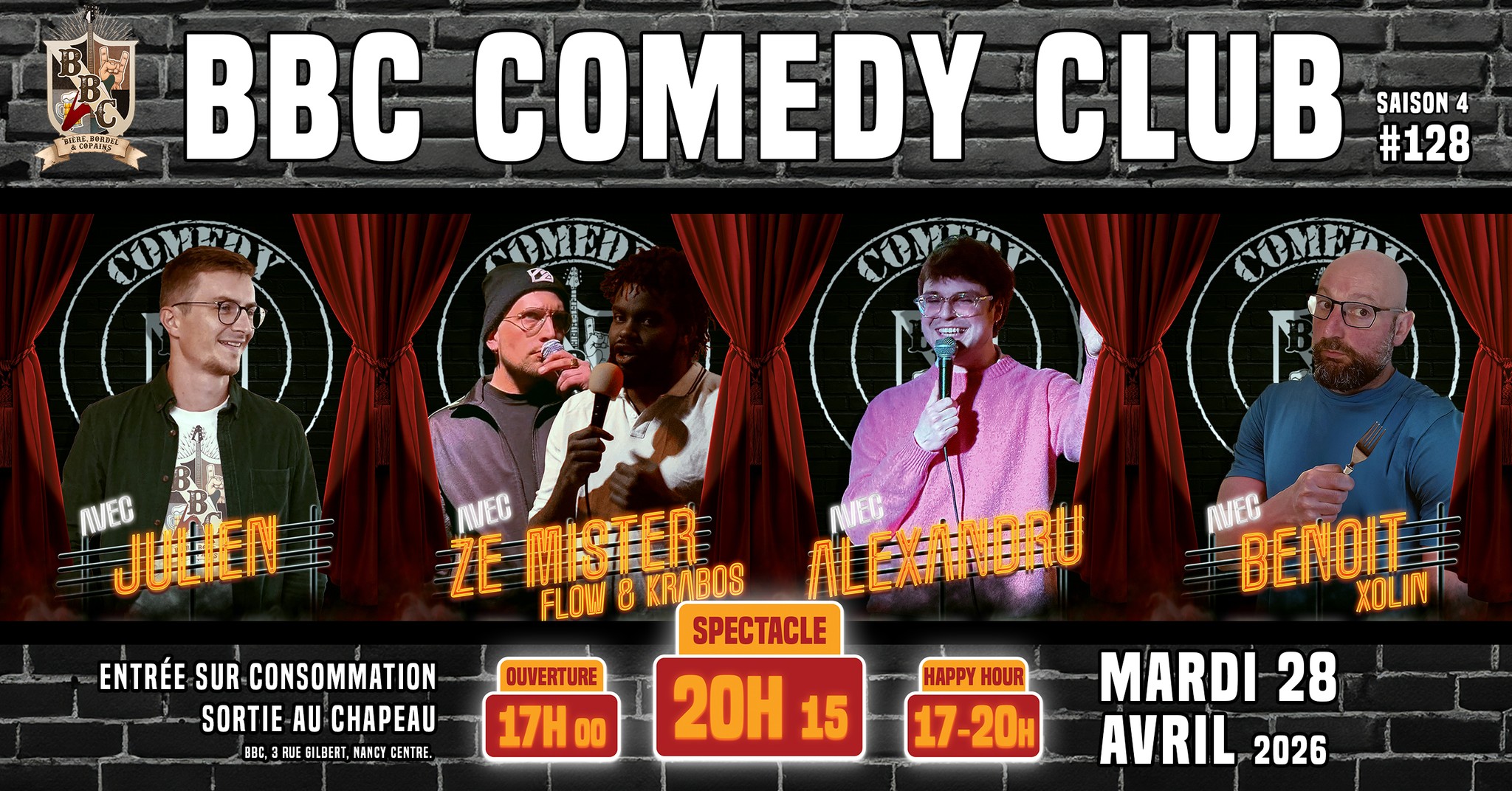 Le mardi 28 avril 2026 à partir de 20h15 - 🎙️ BBC COMEDY CLUB 😂 Soirée stand-up 🎙️#128
